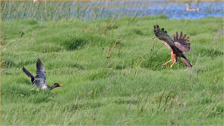 African marsh harrier catching yellow-billed duckling